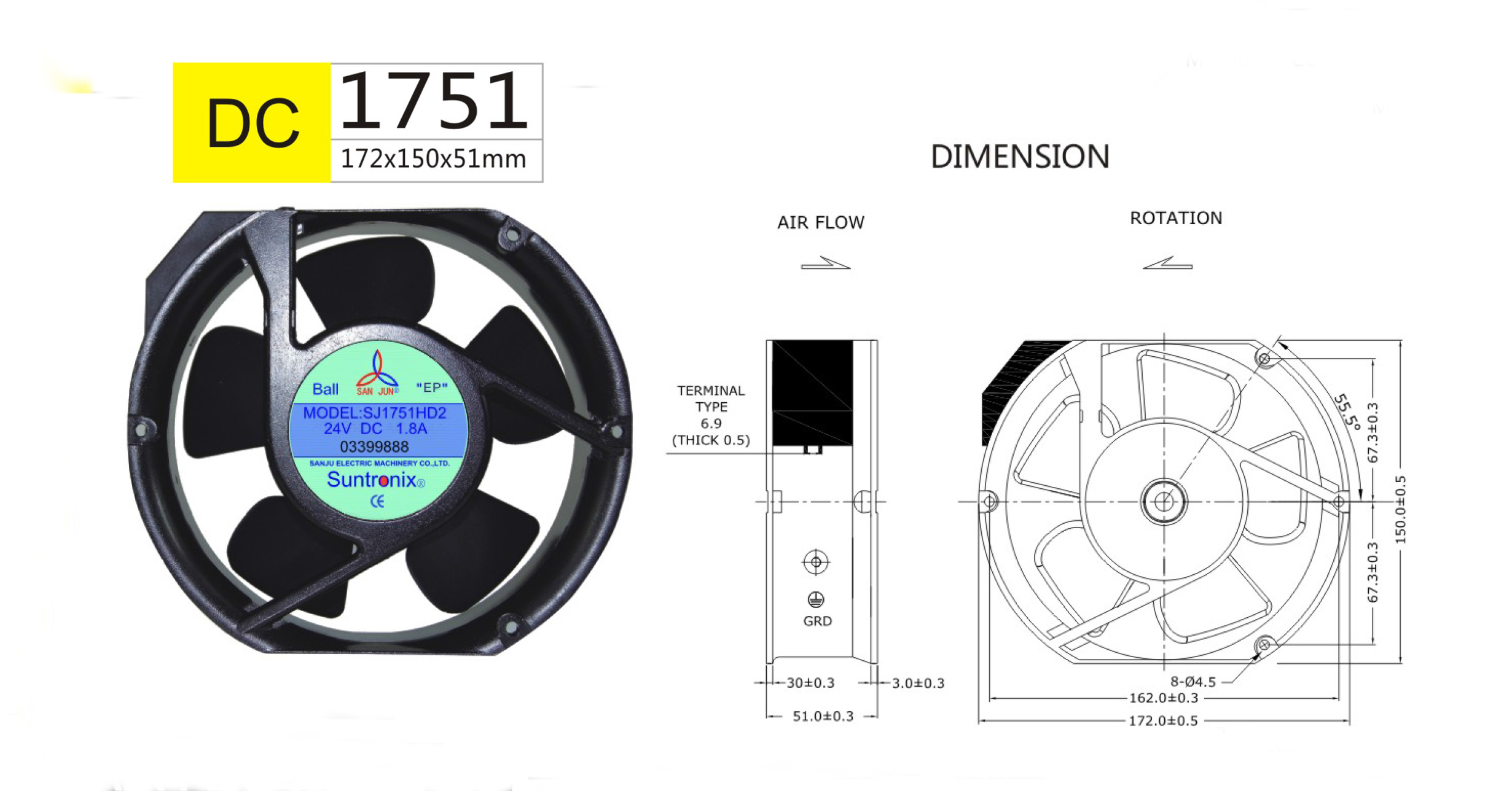 三巨電機(jī)散熱風(fēng)扇廠家專注如AC軸流風(fēng)扇,DC直流散熱風(fēng)機(jī)生產(chǎn)尺寸:172x150x51mm